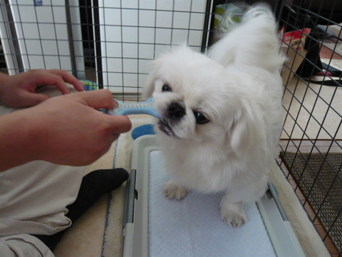 歯磨きは全然ダメだったので、ちょっとしたグッズを 買ってきてみました。 デンタルボーン 骨の形をしたおもちゃのようですが、 突起のようにブラシがついています。 これを噛んでいれば、歯磨き代わりになるのかな? クルーズは早速、おもちゃだと思ったようで、 かみかみするワン と、早速、オットの手を借りて噛み始めました。 その後も1人で遊んでいたので、効果があるといいなー。 ランキング参加中!口臭対策を始めたクルーズに1票を!