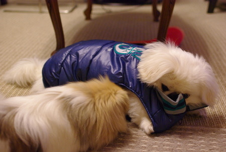 パトちゃんもお洋服脱げちゃったんですねー。 クルーズは子供の頃からすぐに洋服を脱ぐ確信犯です。 裸族なのかも(笑 ペキニーズ、確かに首が太いです!!