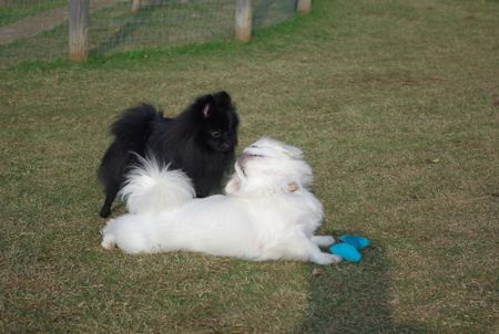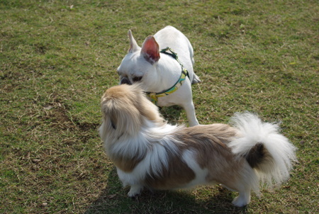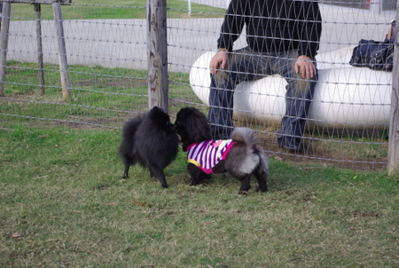 クルーズくん、自然にバッグから、出てきて、モモの臭い嗅いだり、ほかのワンちゃんのおもちゃで、遊んだり、、とても自然でした~、よかったですね!! 皆小型犬で、相性がよくて、ラン楽しめました!!