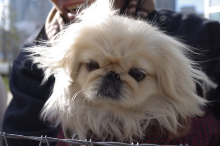 土曜日は電車が止まるほどの強風だったので、他のワンコも数えるほどしかおらず、 半貸切状態でした。 最初のうちはあまり風もなかたのですが・・・強風来たぁぁぁ!!! 人間も飛ばされそうな強風に、制限時間前に撤収しました。 ドッグランで遊んでいたら、柵の外にペキニーズ発見!!