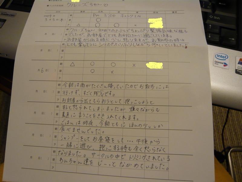 今まではいつも私の実家で両親に預かってもらっていました。 でも、クルーズには若いうちに色々な経験を積んでもらいたいと思い、 昨日は初めてペットホテルに預けてみました。 いつもお世話になっているペットサロンが併設しているホテルなので、 トリマーさん達とも顔見知りで心配はしていませんでした。 ホテルで過ごしてもらったのは約24時間で、お迎えに行ってみると・・・ サークルの中にいたクルーズ 私たちが何度も窓越しに声を出したり、名前を呼んだりしていたのに、 サークルの中にあったタオルやおもちゃで遊んでいて全然気づきません ![]() スタッフさんが預けている間の様子をカルテに書いてくれました。