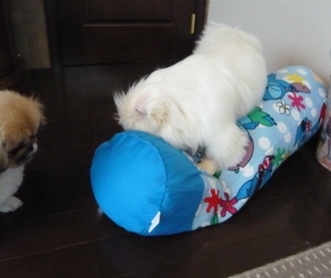 お~スティッチのロングクッションだ~^^ クルーズくん早速齧って・・・馬乗りで遊んでるんですね! マーブルちゃんの熱い視線が・・・仲良く齧った・・・遊んだかな?・・・スティッチ好きの弟の嫁が見たらヤバイかも^^; ケンぼうさんへ