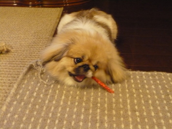 マーブルはペキニーズにしては忠犬なところがあって、 私が帰宅すると、必ず歓迎してくれるんです。 でも、その隙にクルーズは・・・犬ガム泥棒です。 今日も全く同じ展開でした。 が、最終的にはやっぱりマーブルが取り返しました。 女は強し!!!です。 プラチナ肌さんへ