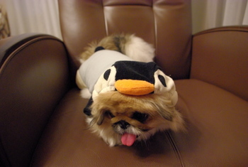 ペンギンの着ぐるみ着たペキニーズ私、ペンギンにされちゃった・・・