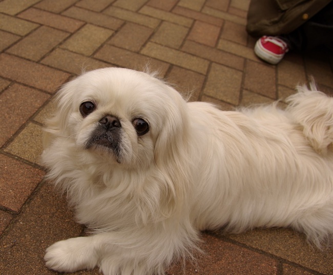 ペー太くんの飼い主、きぬどんさんはよくこのブログにコメントをくれて、 いつか一緒に会いたいですねーと話していたので、お会いできて嬉しかったです。 ペー太くんはおっとりしていて、コートがとってもゴージャスでした。 なんとゆうちゃんは保健所から貰い受けたペキちゃんなのだそうです。 こんなに立派なペキちゃんがナゼ???と思う一方で、 とても優しそうなご家族に迎えられて良かったなーとも思いました。 見覚えのある優しそうな女性とおっとりした白ペキちゃんが・・・と思ったら、 うめちゃんと飼い主のmanamiさんでした。 ペキニーズならではのペッタンコポーズを決めてくれたうめちゃん! ペキニーズ展効果でしょうか・・・