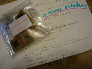 さすがに耳毛とかお腹回りの毛がボサボサになってしまったので、 日曜日にカットへ連れて行きました。 帰ってきたら・・・ すっきりしたかワン? この日はクリスマス柄のバンダナをしてもらったのですが、 カットしたとは言え、胸の毛が長くてほとんど見えません。 違う角度から見てみると・・・あれ?? 似合っているかワン? 耳毛が短くなったせいか、顔が幼く見えます。名づけるなら童顔カット!?? あと、身体のラインに沿って全体的にカットをしてくれたようで、 ちょっと痩せて見えるようになりました。 誕生日プレゼントをもらいました! ちょうど誕生月だったので、カット料金も安くなった上、 プレゼントまでいただけ、チェックシートまで可愛く書いてくれて 至れり尽くせりですねー。 ランキング参加中!耳毛をカットしたら童顔になったクルーズに1票を!