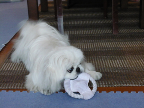 私が帰宅するのが遅かったのですが、 その間にクルーズはオットから新しい円盤(おもちゃ)をもらったよう。 今朝は嬉しそうに円盤で遊んでいました。 円盤大好きだワン 円盤遊びに夢中になっていたので、先日までご執心だった 骨型のおもちゃはもうお役ご免かなーと思って私が遊んでいたら、 音に反応してやってきた挙句・・・ ボーンは渡さないワン と咥えて持っていってしまいました。 その隙に円盤を取って遊んでいたら・・・また取り返しに来て しばらくその繰り返し状態でした。 結論:クルーズは円盤もボーンもどっちも好きらしい 円盤もボーンも大好きで、飼い主にも貸してくれないクルーズに一票を。